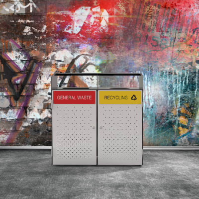 Compact single, double litter bin housings with hood. Panels in hardwood, Duraslat™ XG or v-groove compact laminate colours and powder-coat finishes.
