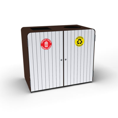 Compact capsule double bin housing for undercover. Panels in hardwood, Duraslat™ XG, v-groove compact laminate or powder-coat finishes.