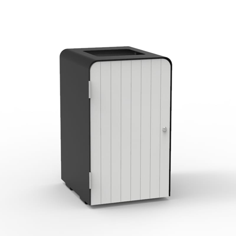 Compact capsule single bin housing for undercover. Panels in hardwood, Duraslat™ XG, powder-coat finishes.