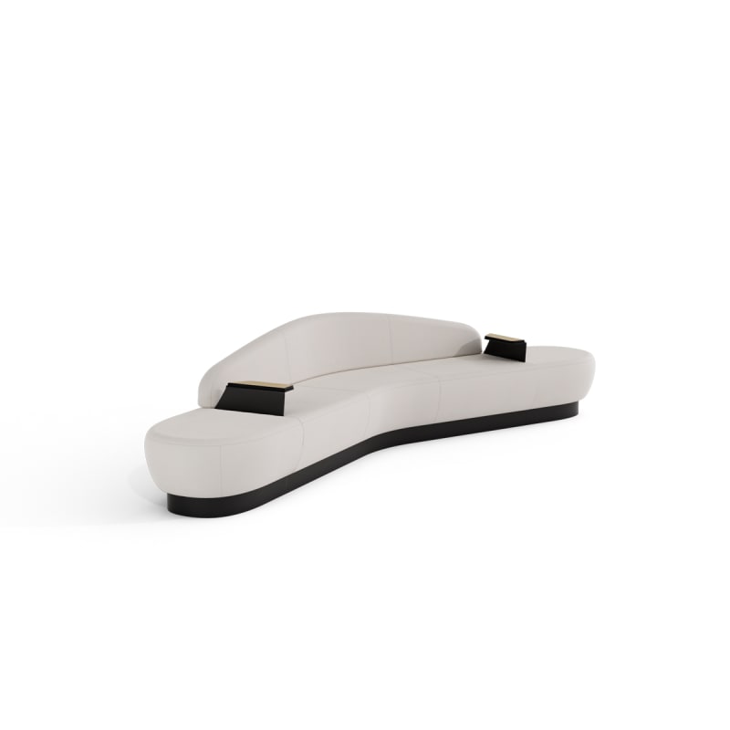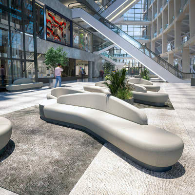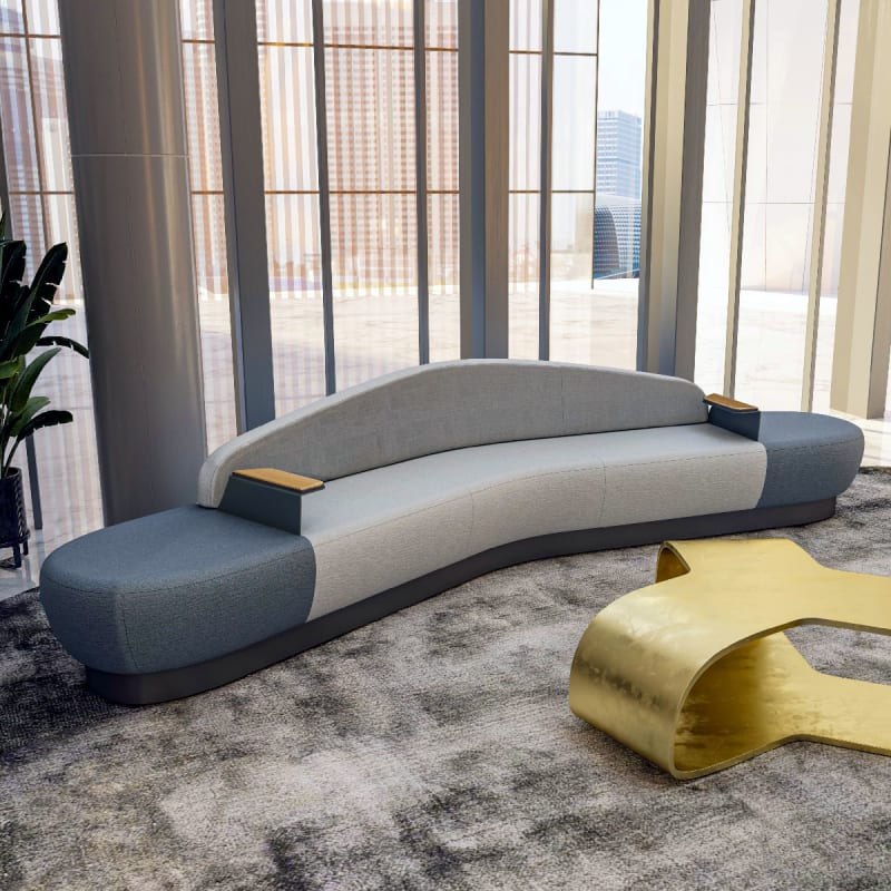 Modern, modular, concave seat design. Mix and match upholstery fabrics, multipurpose compact laminates, solid surfaces, and powder-coat colours.